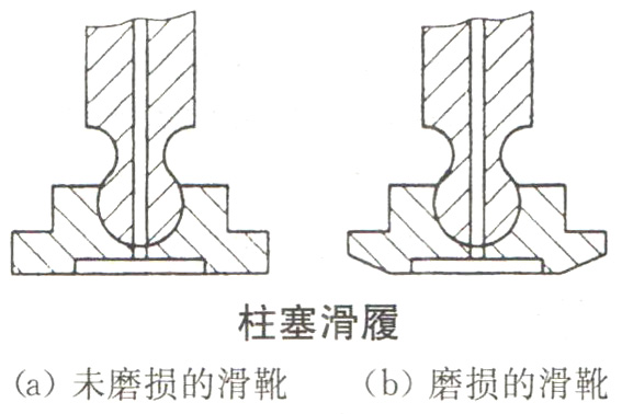 為了延長液壓油泵的使用壽命,必須定期在油路的紊流處取出油樣檢驗。保持油液的清潔度是系統維護保養的重要內容,有時系統不能正常運行,就是因為控制閥閥芯被油污卡死,或產生阻尼、運動不暢。出現故障時又找不著其他原因,則清洗相關的控制閥(特別是比例閥)是重要的措施。軸向柱塞泵的損壞是從柱塞滑靴的磨損開始的,如下圖所示。當滑靴磨損到不能形成與斜盤間的靜壓油膜時,則滑靴與斜盤間的摩擦力增大,斜盤被拉傷,摩擦力進一步增大,回程盤破裂,泵的內部損毀,所以定期將磨損(還未完全損壞)的滑靴換掉就可以避免整泵的損壞。